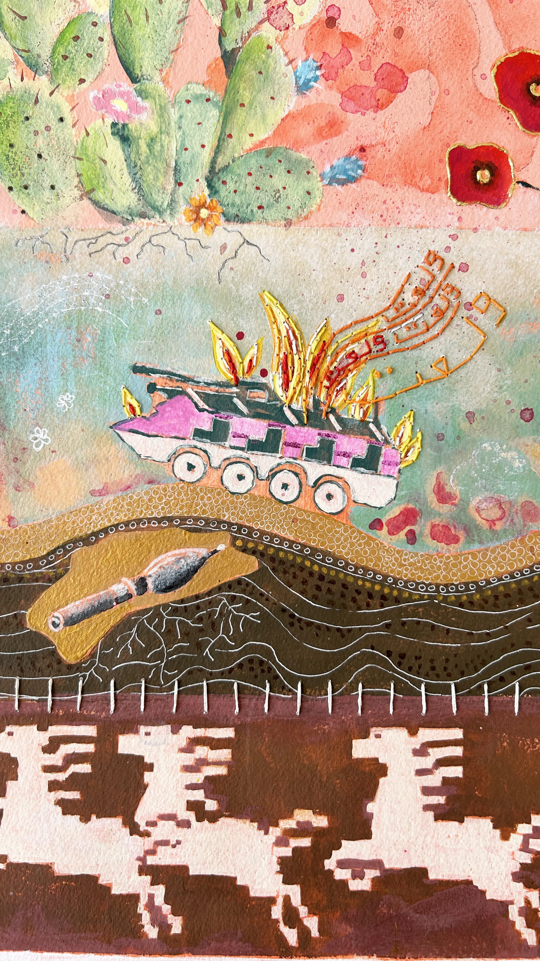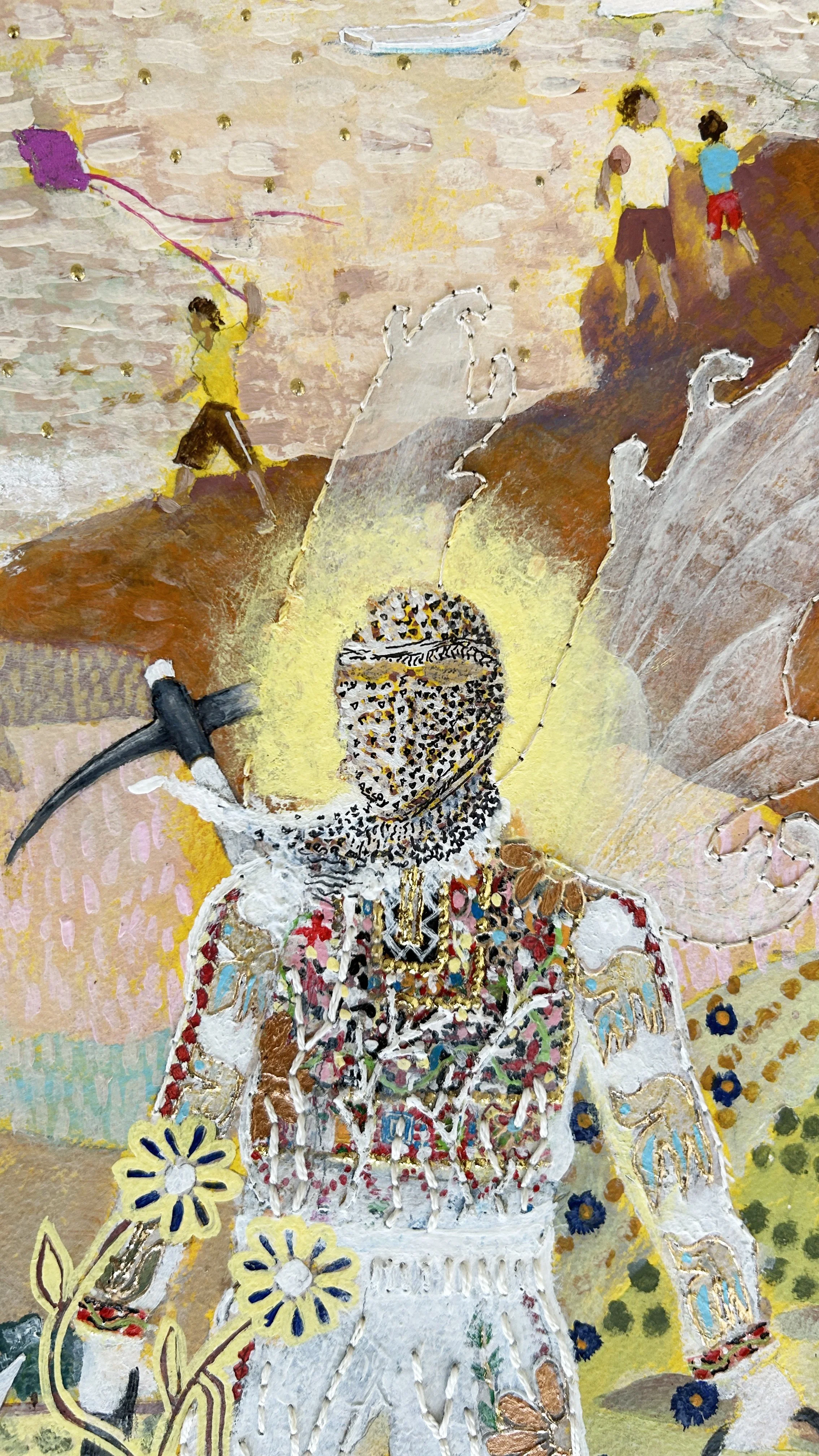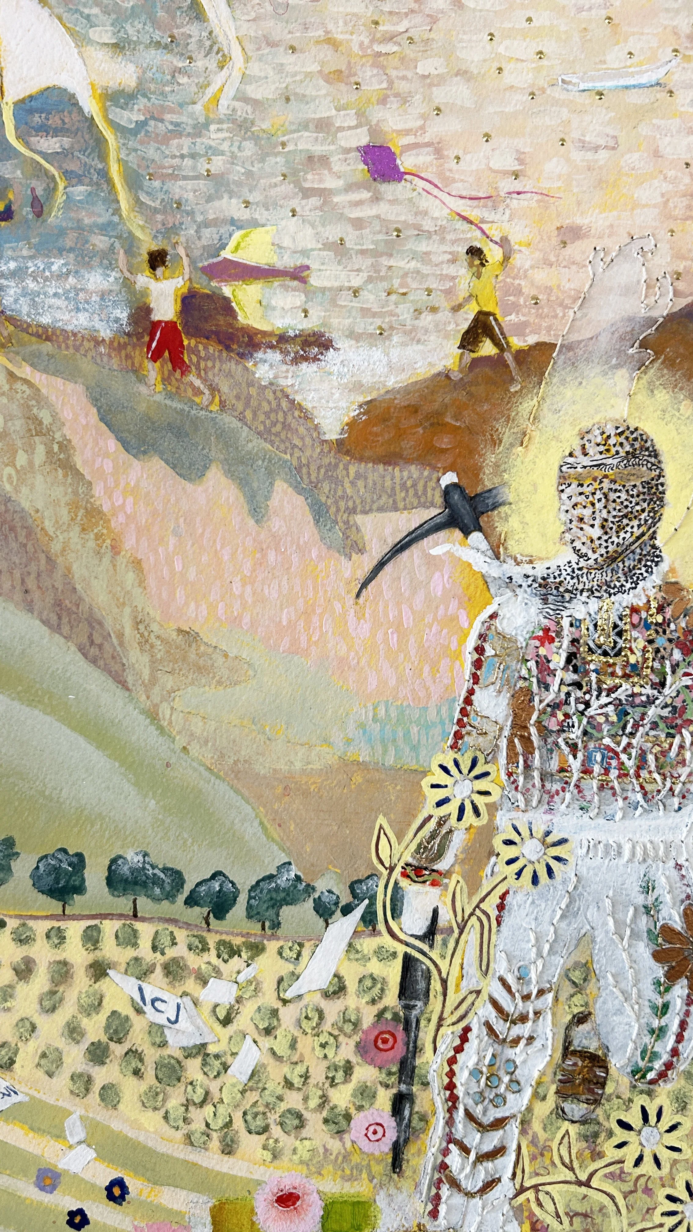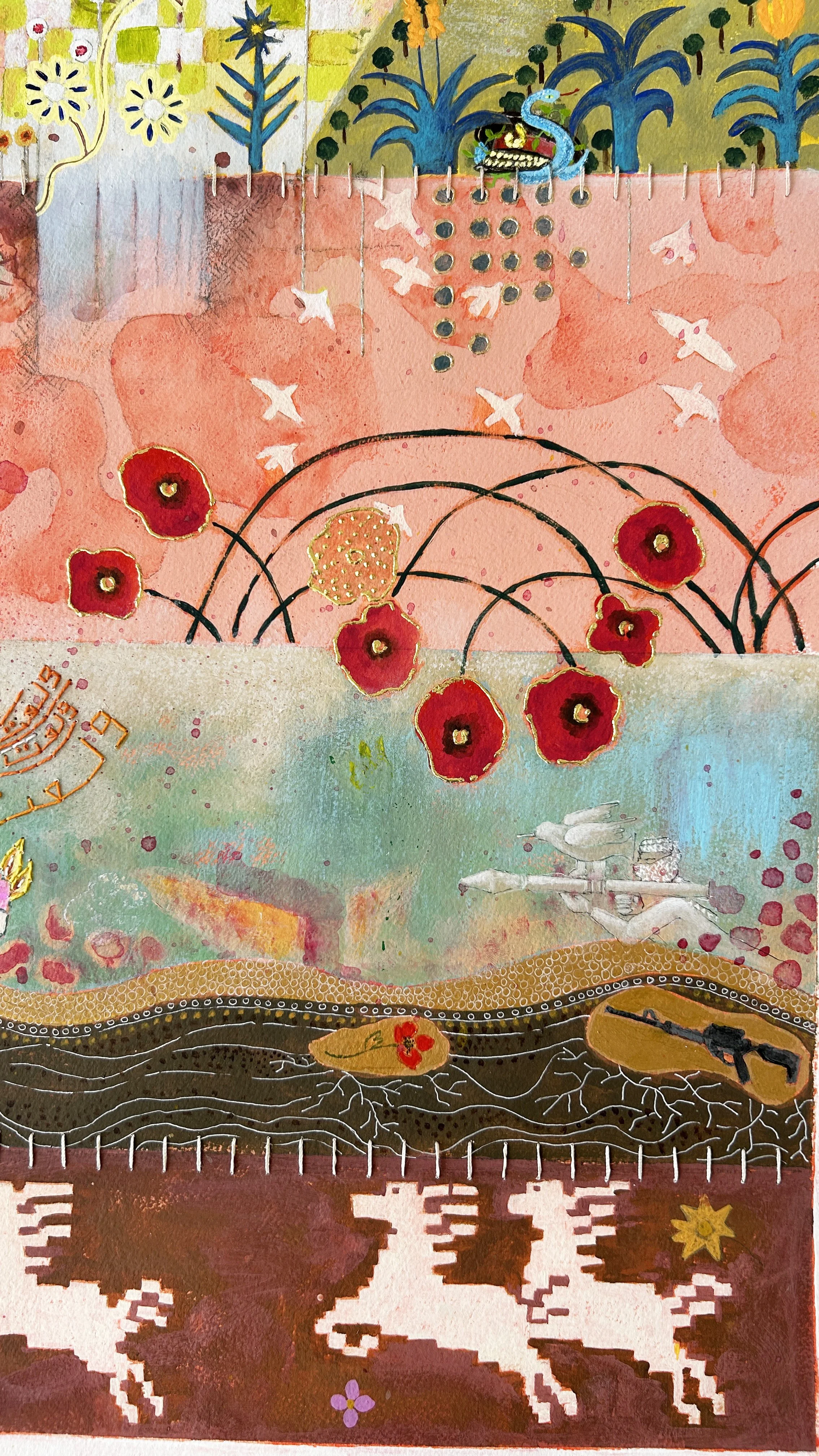 Water color, Acrylic, thread, 24K gold & metal leaf on cotton paper