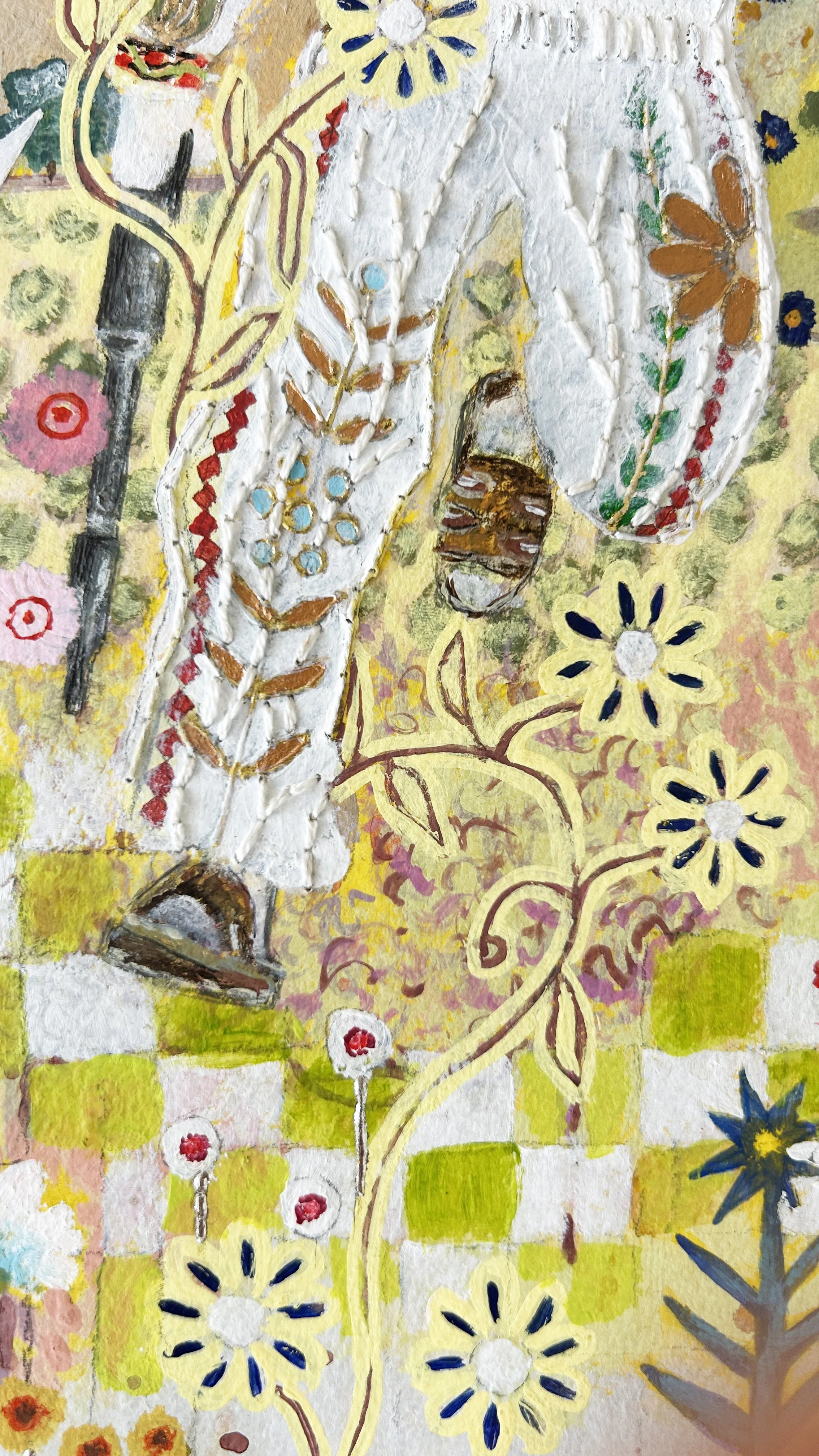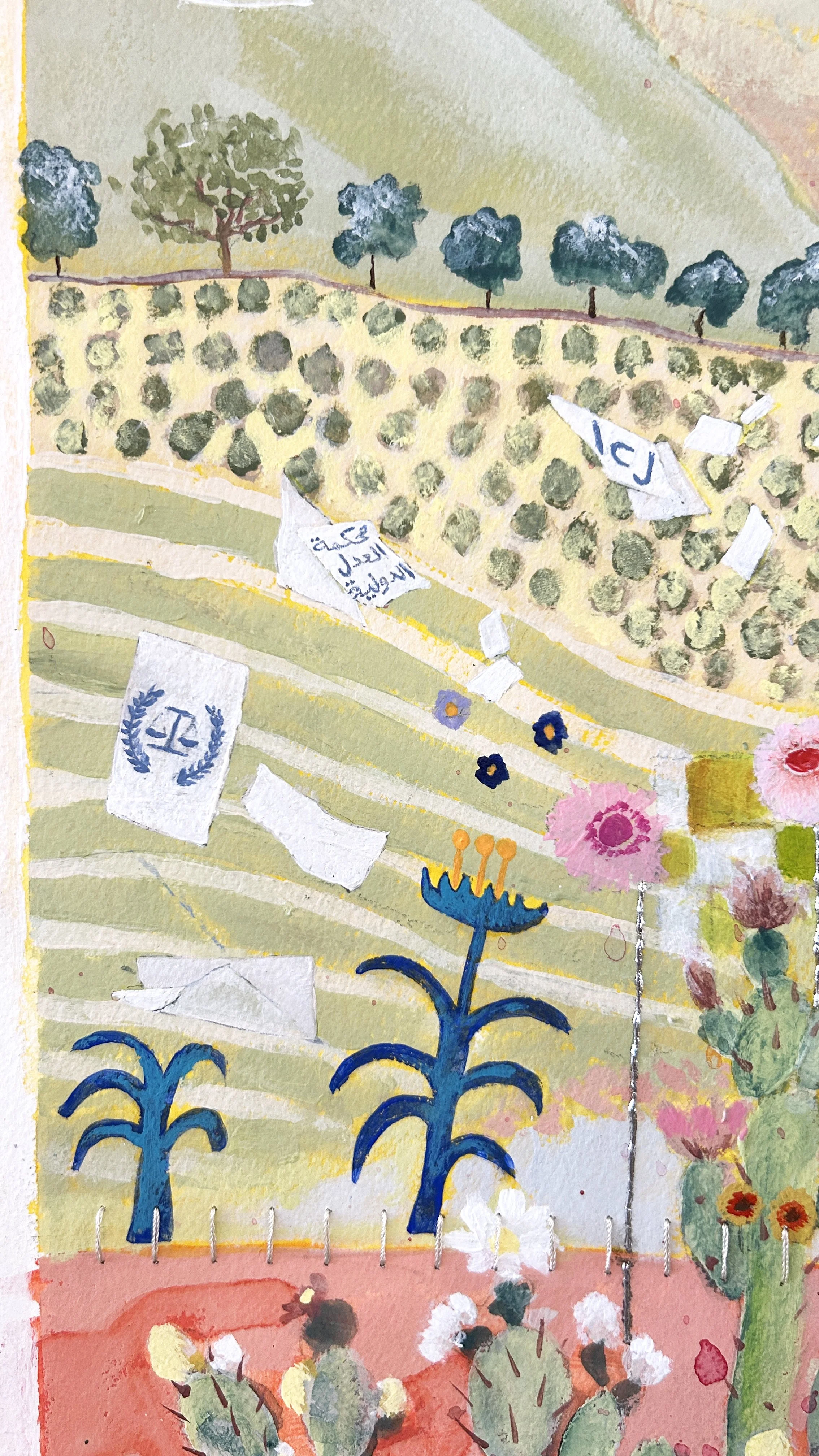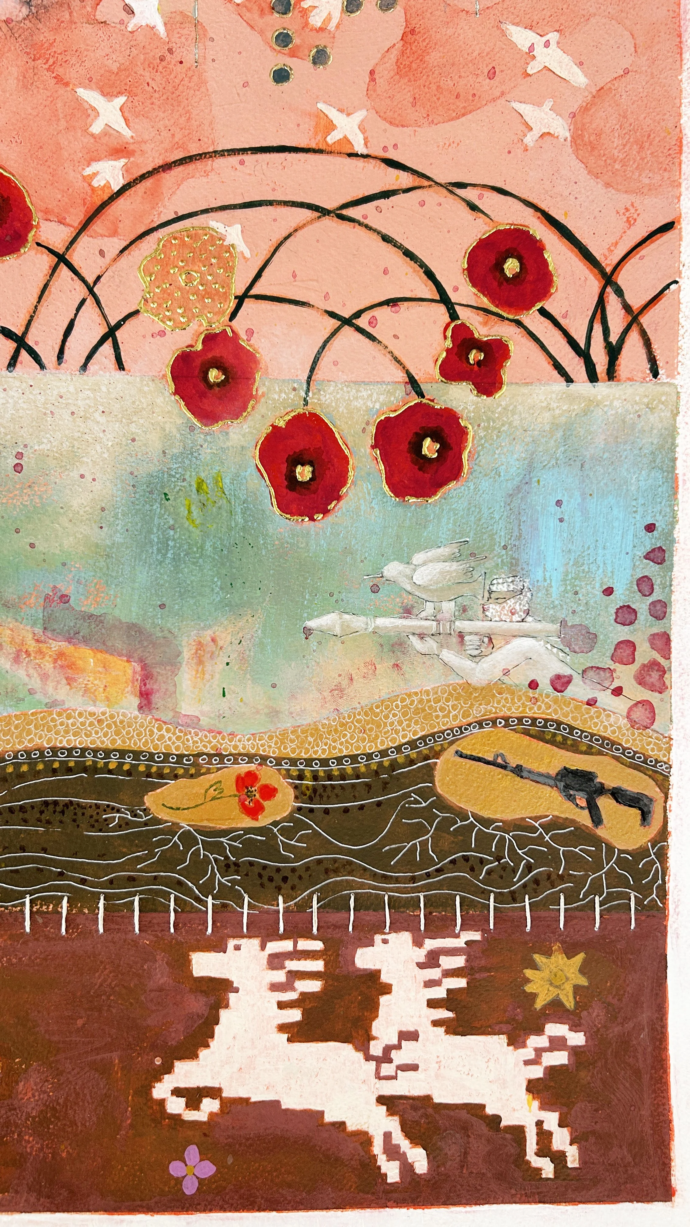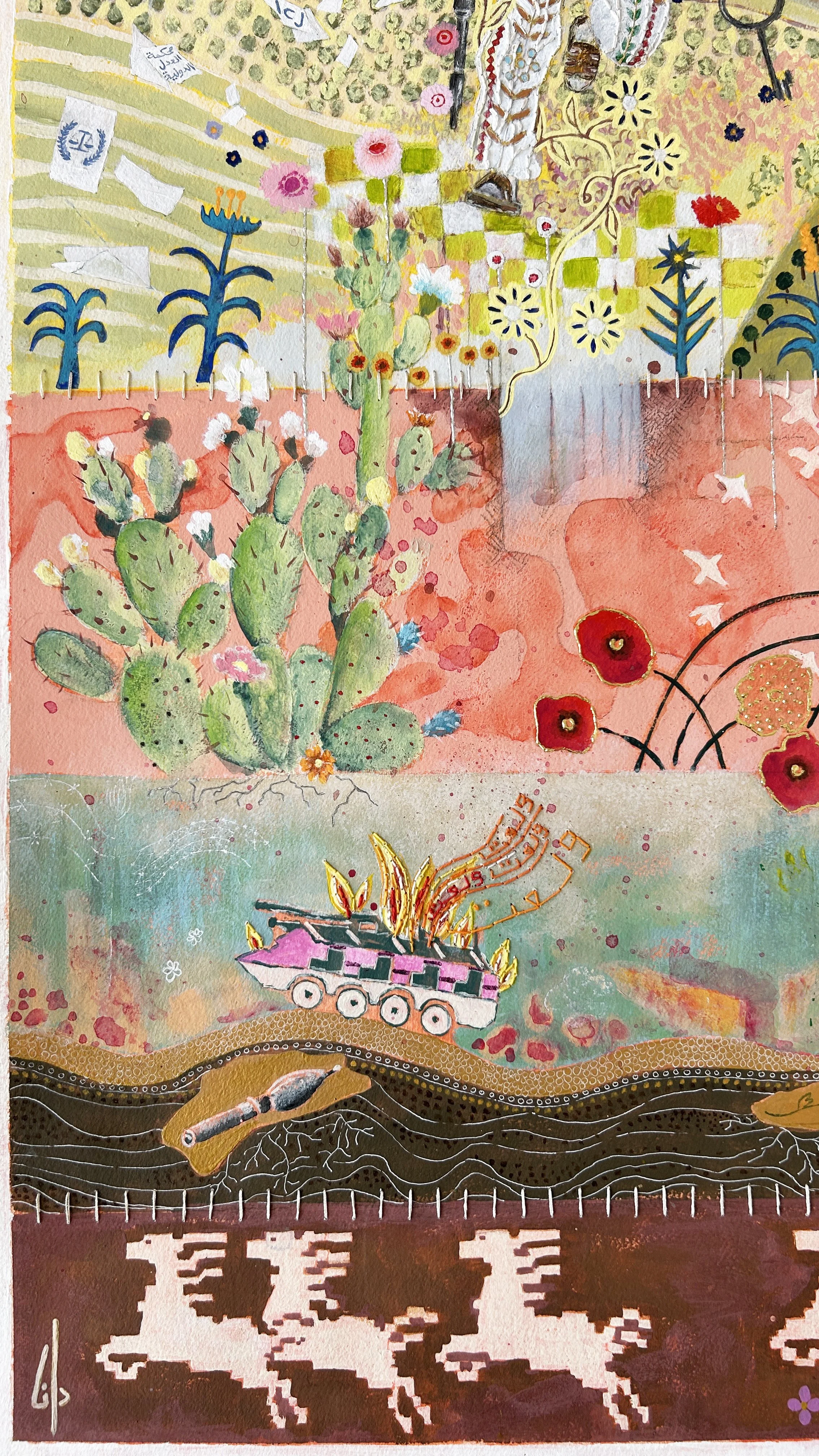 Water color, Acrylic, thread, 24K gold & metal leaf on cotton paper